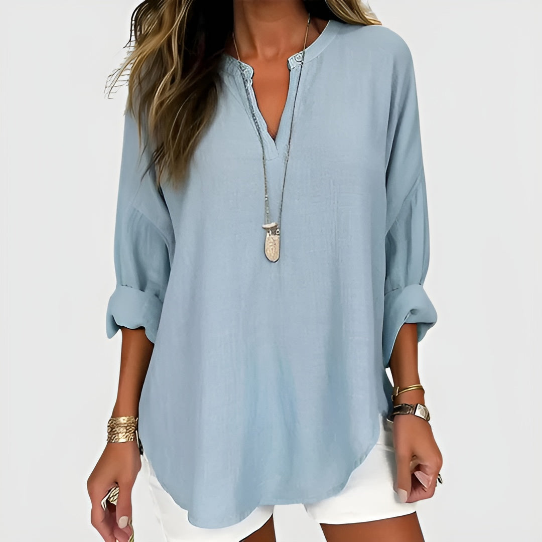 Sofie™-blusen er lavet af åndbart hør, der holder dig kølig og komfortabel, selv på varme dage. Den løse pasform og den elegante blå farve gør denne bluse velegnet til forskellige lejligheder, fra en dag på stranden til en aften ude.